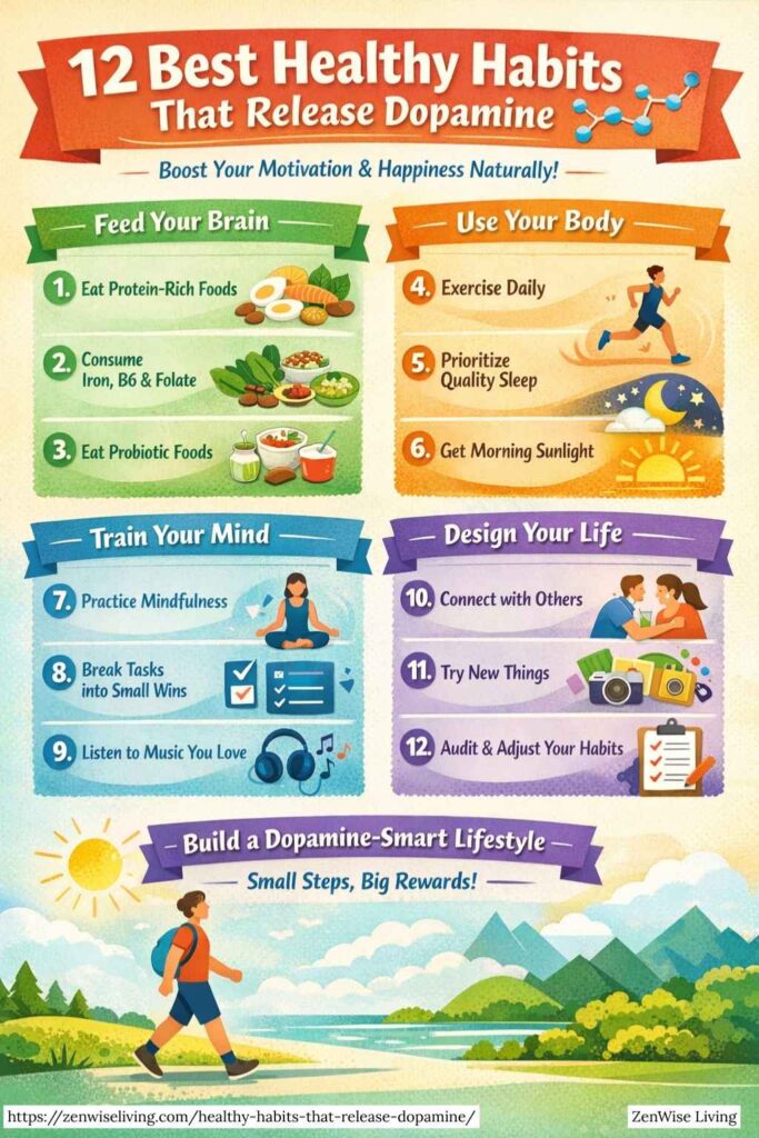 This guide will walk you through the 12 best healthy habits that release dopamine naturally, helping you design a life with less mental clutter and more consistent flow.